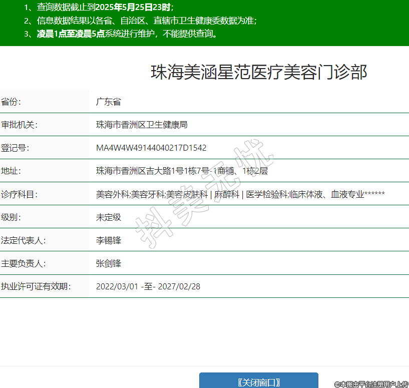 省份:廣東省審批機關:珠海市香洲區(qū)衛(wèi)生健康局登記號:MA4W4W49144040217D1542地址:珠海市香洲區(qū)吉大路1號1棟7號-1商鋪、1棟2層診療科目:美容外科;美容牙科;美容皮膚科 | 麻醉科 | 醫(yī)學檢驗科;臨床體液、血液專業(yè)******級別:未定級法定代表人:李錫鋒主要負責人:張劍鋒執(zhí)業(yè)許可證有效期:2022/03/01 -至- 2027/02/28 -