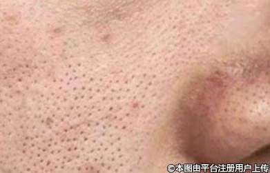 肌膚像風干的橘子皮,毛孔粗大出現(xiàn)在鼻翼兩側(cè)等臉頰部位,毛孔呈橢圓形。