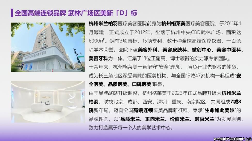 感謝您一直以來對杭州格萊美的信任和支持為給您提供更優(yōu)質(zhì)的服務(wù)和更優(yōu)雅的變美享受原杭州格萊美醫(yī)療美容醫(yī)院品牌全面升級為杭州米蘭柏羽醫(yī)療美容醫(yī)院與四川米蘭柏羽總院、成都高新米蘭柏羽、西安米蘭柏羽深圳米蘭柏羽共同形成全國連鎖高端品質(zhì)醫(yī)美新布局品牌升級工作為本院品牌戰(zhàn)略調(diào)整您在本院的消費記錄、未治療項目、積分等均不受影響為您服務(wù)的咨詢團(tuán)隊、醫(yī)生團(tuán)隊亦無變動。