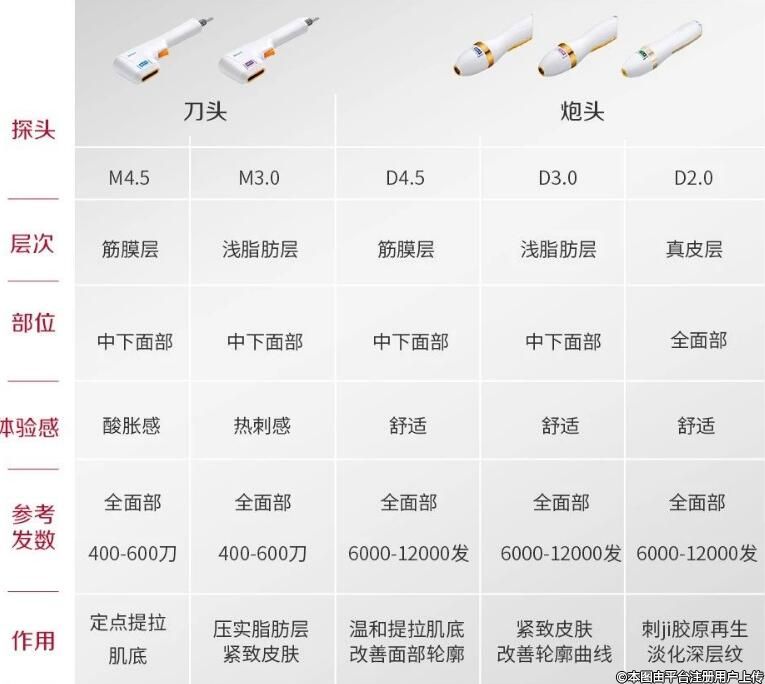 刀頭M4.5+刀頭M3.0+炮頭D4.5+炮頭D3.0(俗稱:2刀2炮)適合:中重度面部松弛下垂、皺紋嚴(yán)重、肉肉臉、下頜脂肪堆積、眼周松弛、口角囊?guī)А㈦p下巴、法令紋等