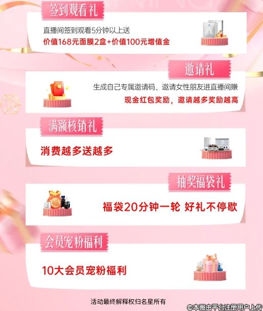 1、直播觀看5分鐘簽到就送168元面膜兩盒+100元增值金