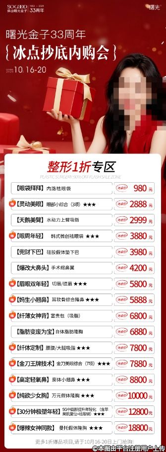 33周年超級千萬補貼派送,平時不舍得買的大項目:抗衰年卡、貴婦卡、全臉/形體塑形、眼鼻胸整形,這次直接抄底1折價拿下!